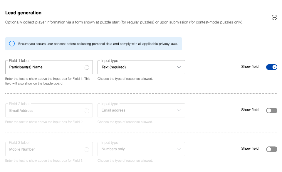 When enabled, this setting allows you to collect player information when they start or complete puzzles. This is useful for contests, newsletters, or building your audience.