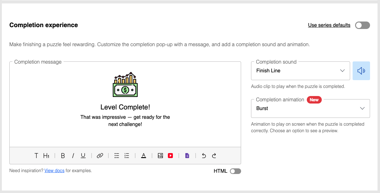Make finishing a puzzle feel rewarding. Customize the completion pop-up with a message, and add a completion sound and animation.