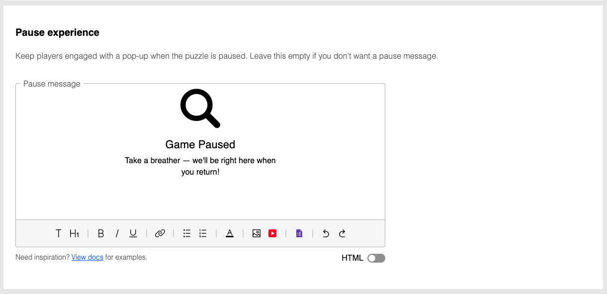 Keep players engaged with a pop-up when the puzzle is paused. Leave this empty if you don't want a pause message.