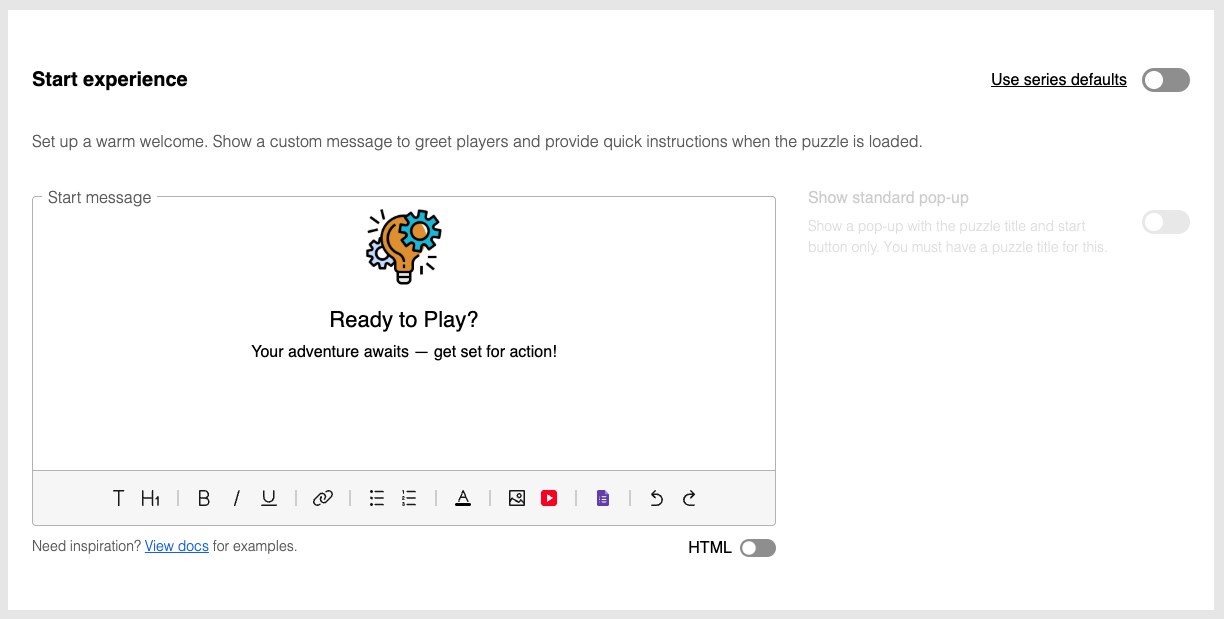 Set up a warm welcome for your players. Show a custom message to greet players and provide quick instructions when the puzzle is loaded. A well-crafted start message can significantly improve player engagement and set the right tone for your puzzle experience.