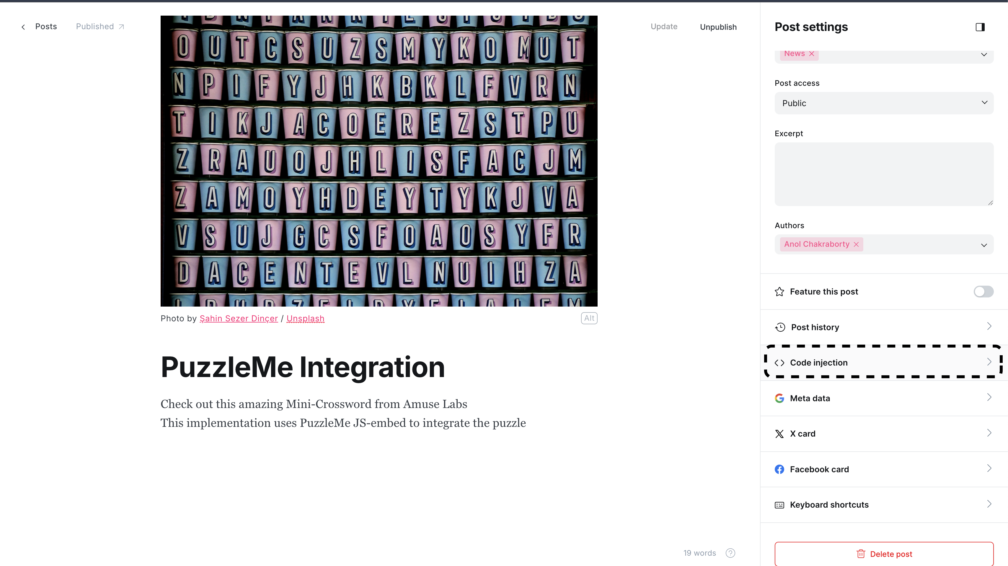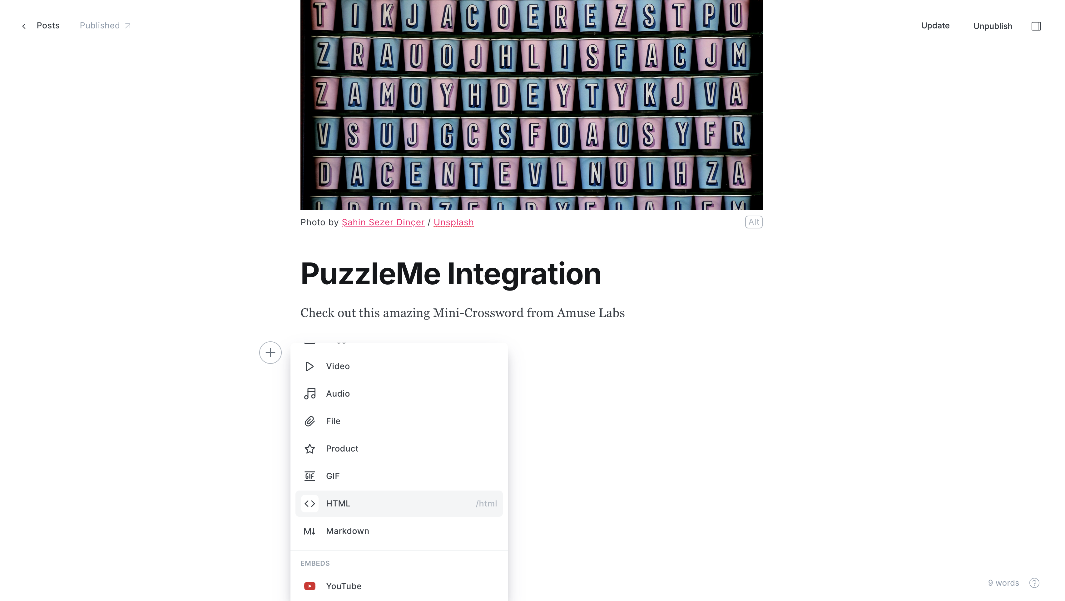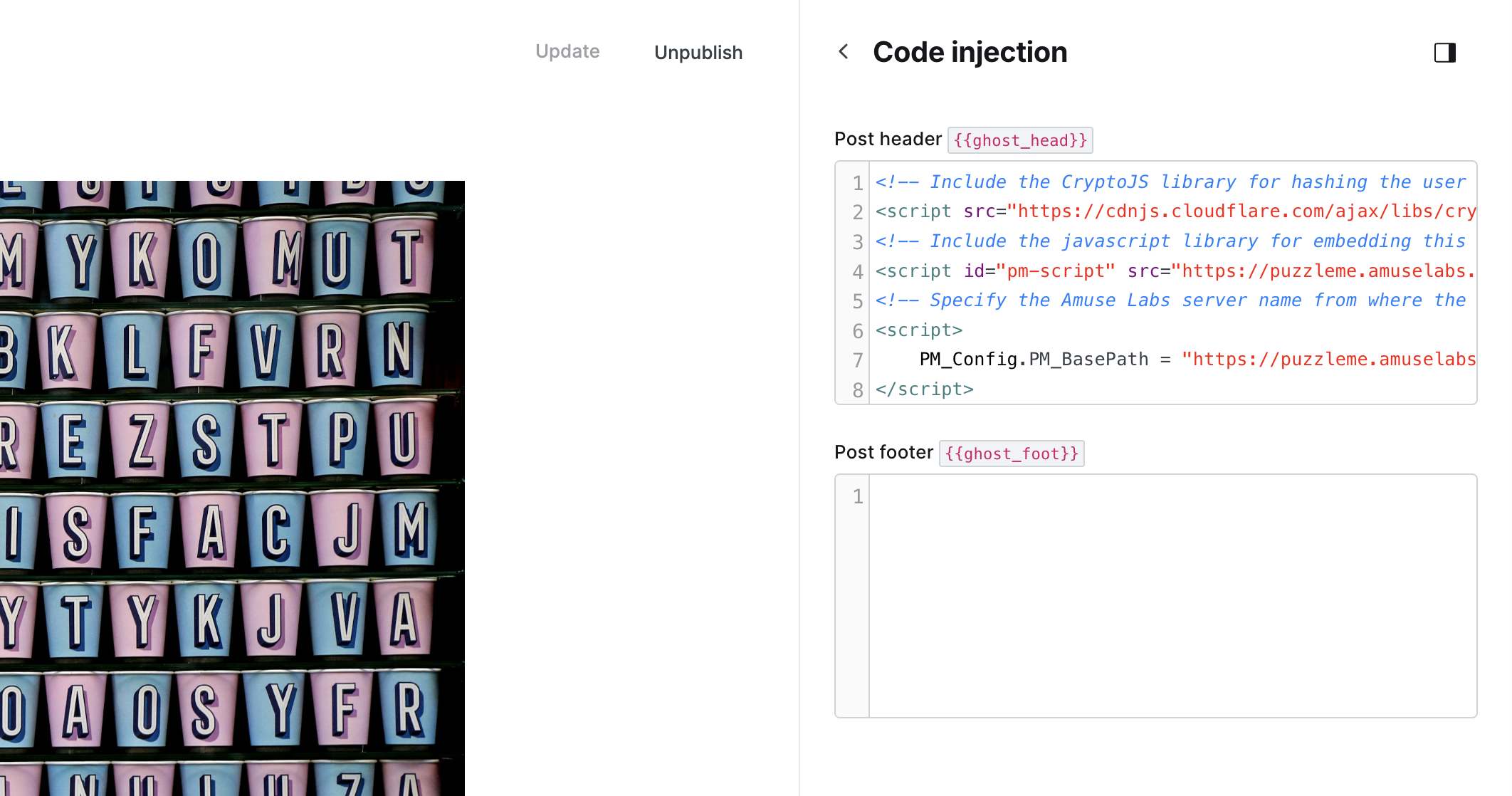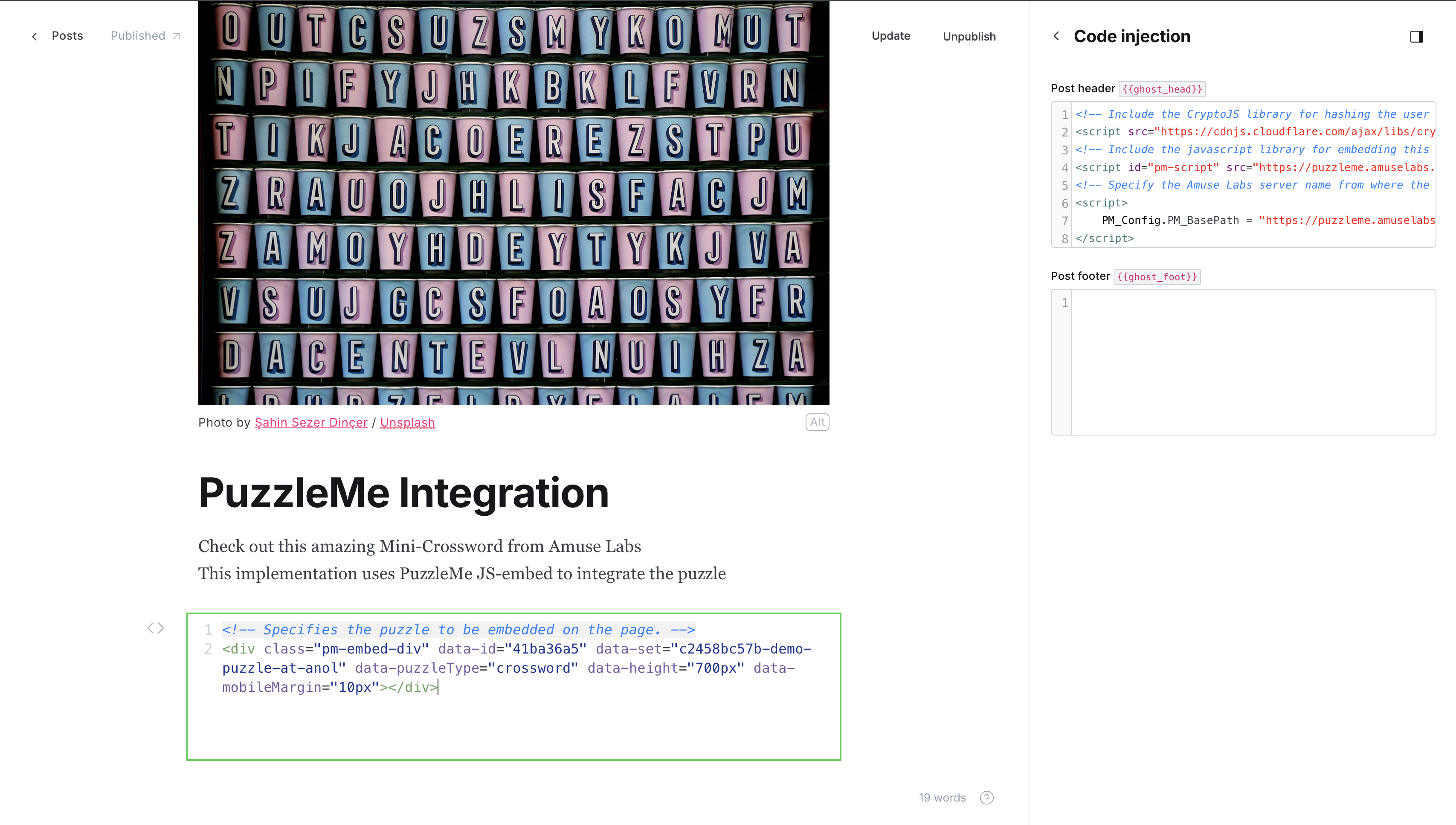 After inserting the <div>tag into your Ghost Page, your final editorial setup should look like this.At last, click on Update, and open the published page to view and interact with the puzzle.