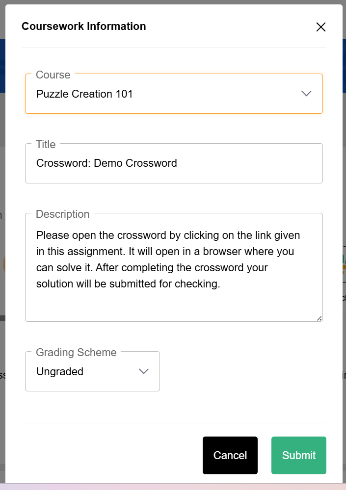 - Course: Select the course you want to assign the puzzle to from the dropdown menu.