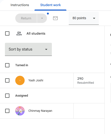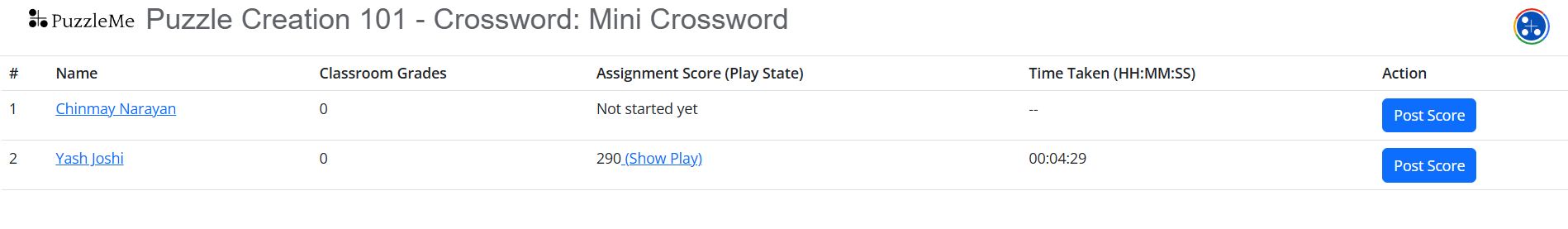 By default, the classroom grade is 0 for each student. To confirm and assign the puzzle score as grades for the assignment, click the Post Score button on the leaderboard page. This will post the marks to the Google Classroom assignment, and the same will be reflected under the "Student work" tab.