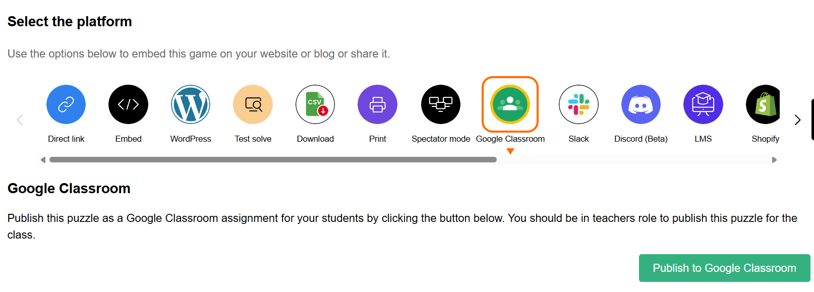 Publish to Google Classroom is currently available only for crosswords and sudokus. Please contact us if you would like to publish other puzzle types to Google Classroom.