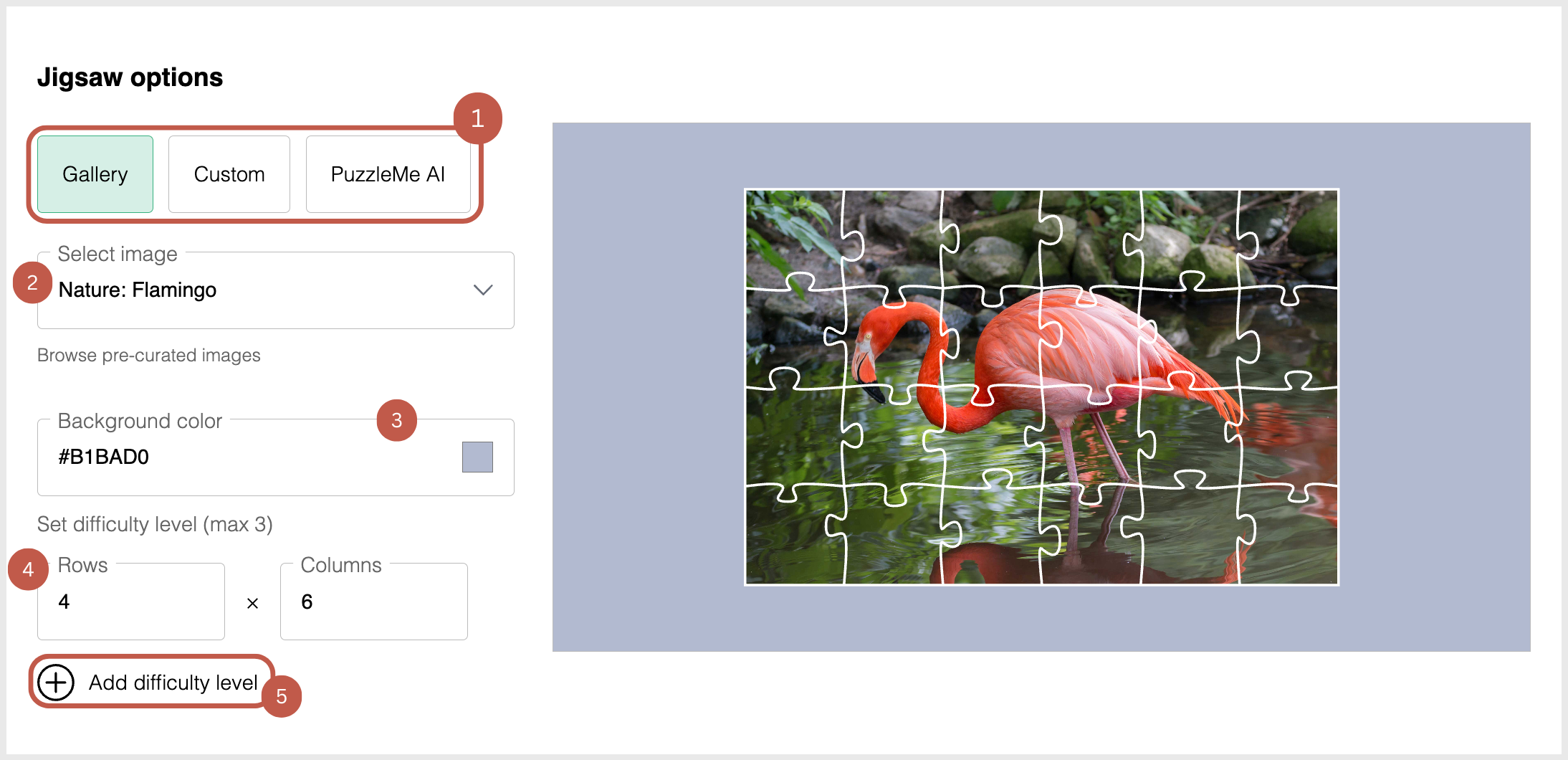 (1) image options, (2) select image dropdown, (3) background color, (4) dimensions (rows and columns), (5) add difficulty level